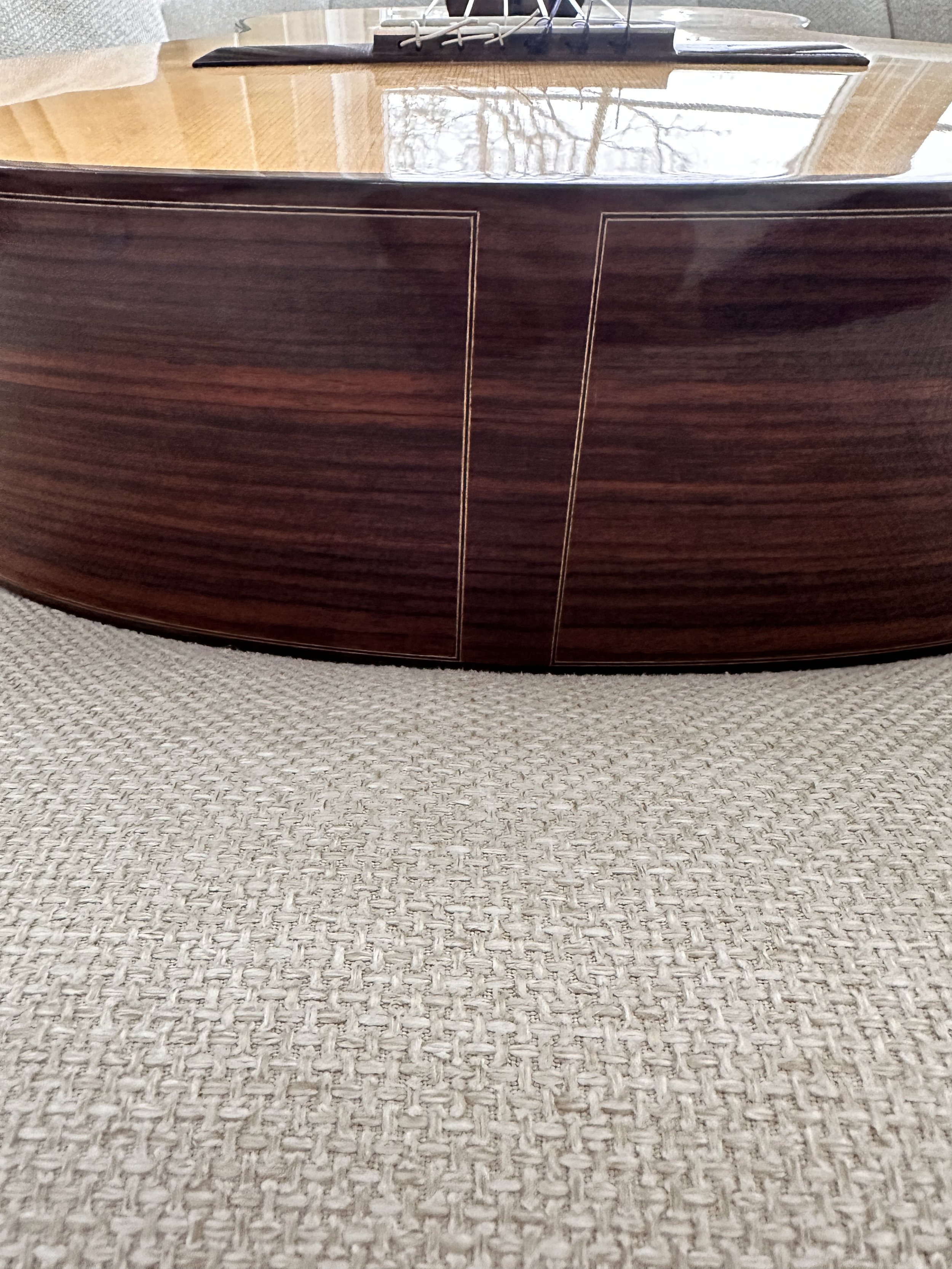 This amazing concert-level guitar has everything you could ask for! Kenny did everything he could to build the best possible guitar. This guitar has a Nomex double top, lattice bracing, and doubled sides. The result is a very natural, traditional, charming, and elegant-sounding guitar, yet with the modern guitar volume that can fill any concert hall you are playing in.