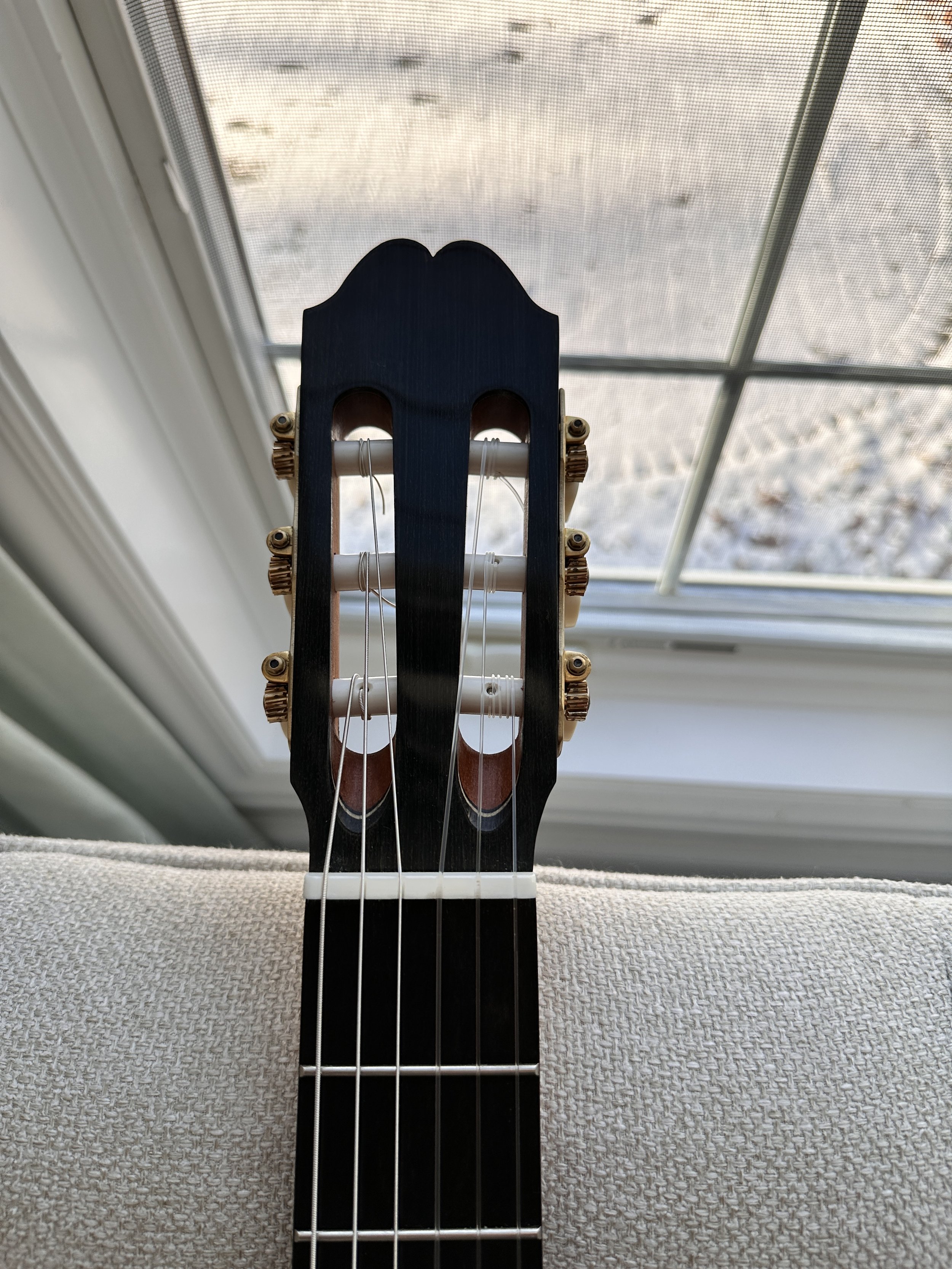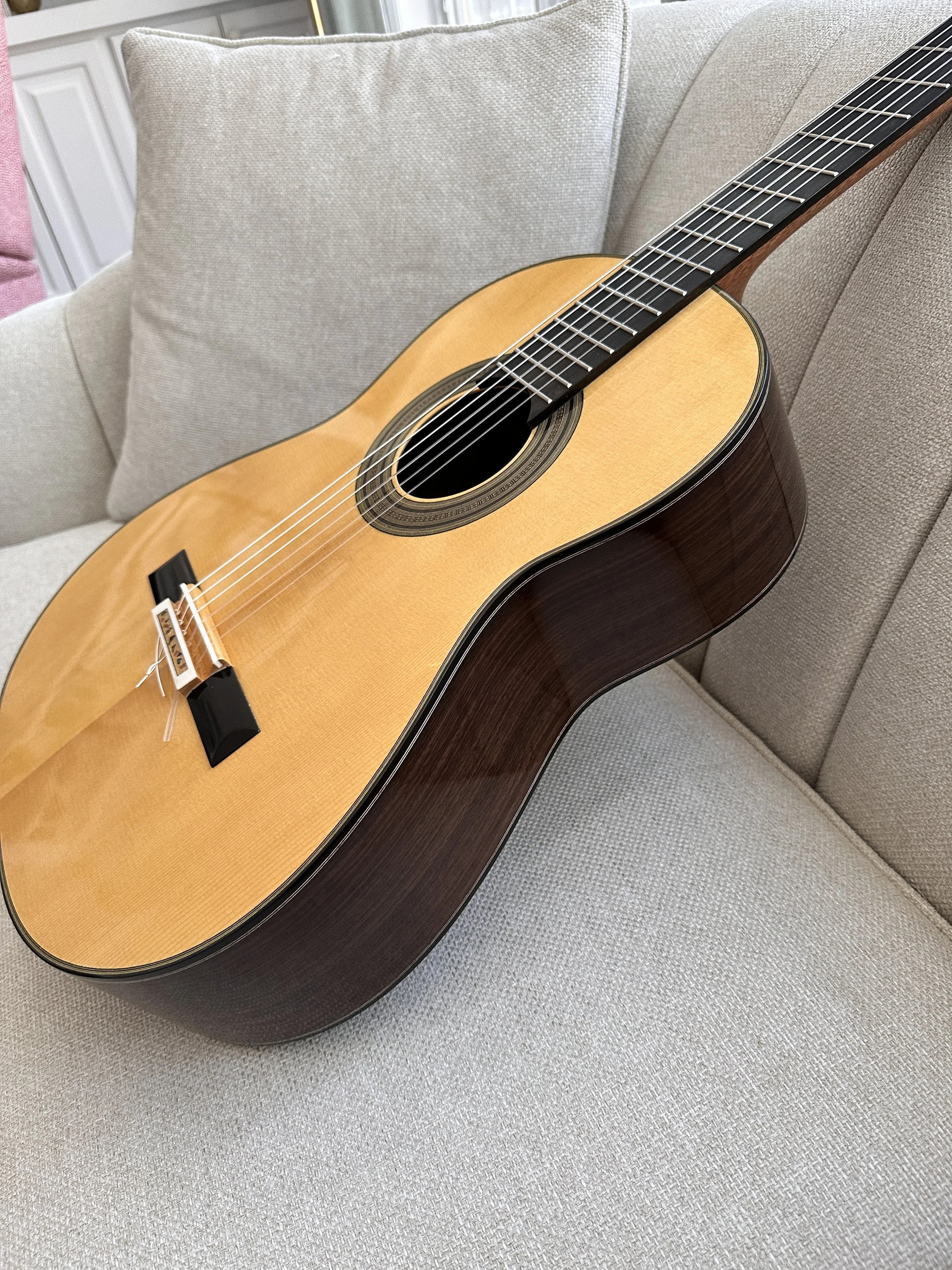 Jialan is an amazing classical guitar player on top being a luthier. He has an outstanding understanding of timbre, control of tone and nail techniques. Before sending out any guitar, he would personally inspect the sound qualities and dynamic range. As a luthier, he is meticulous about the weight of the guitar. This guitar was very lightly built, and to further cut the weight, he used maple instead of rosewood for the bridge. This resulted in a 7 grams weight cut, and even faster response.